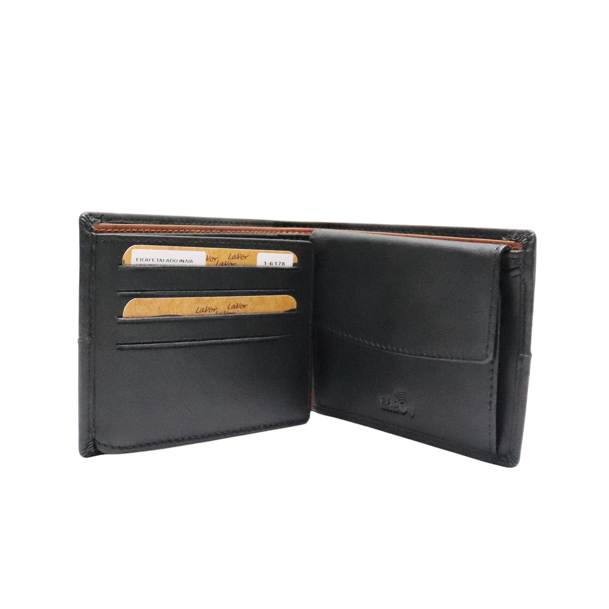 Δερμάτινο πορτοφόλι LaVor. Διαθέτει 2 χώρους για χαρτονομίσματα, τσέπη με καπάκι για κέρματα, θέση για ταυτότητα παλαιού τύπου και 14 θέσεις για κάρτες. Διαθέτει επίσης αντικλεπτική προστασία RFID. Θα το παραλάβετε με το κουτί του.