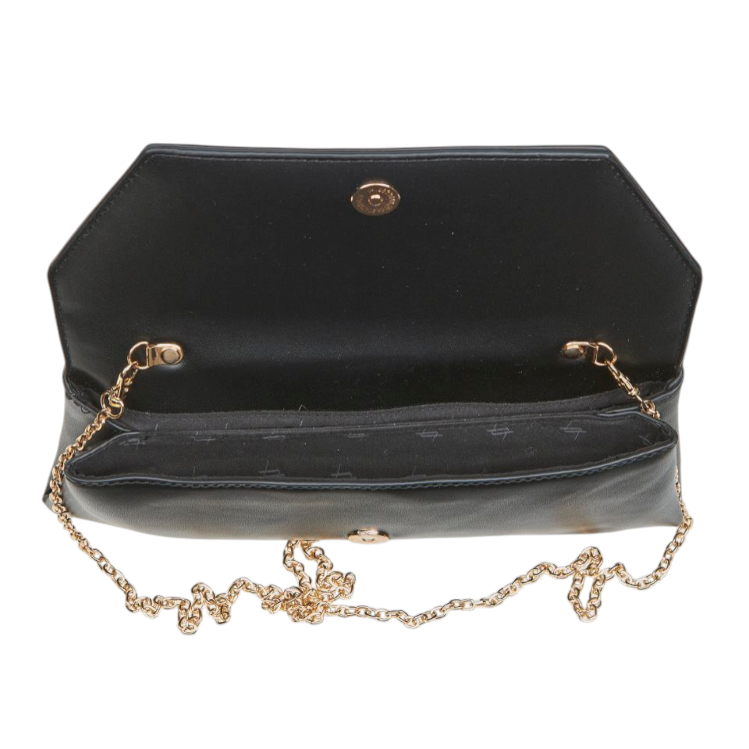 Φάκελος Verde 01-2033. Κλείνει με καπάκι και μαγνητικό κούμπωμα. Εσωτερικά υπάρχουν 2 θέσεις και 1 τσέπη με φερμουάρ. Διαθέτει επίσης μακριά χρυσή αλυσίδα.