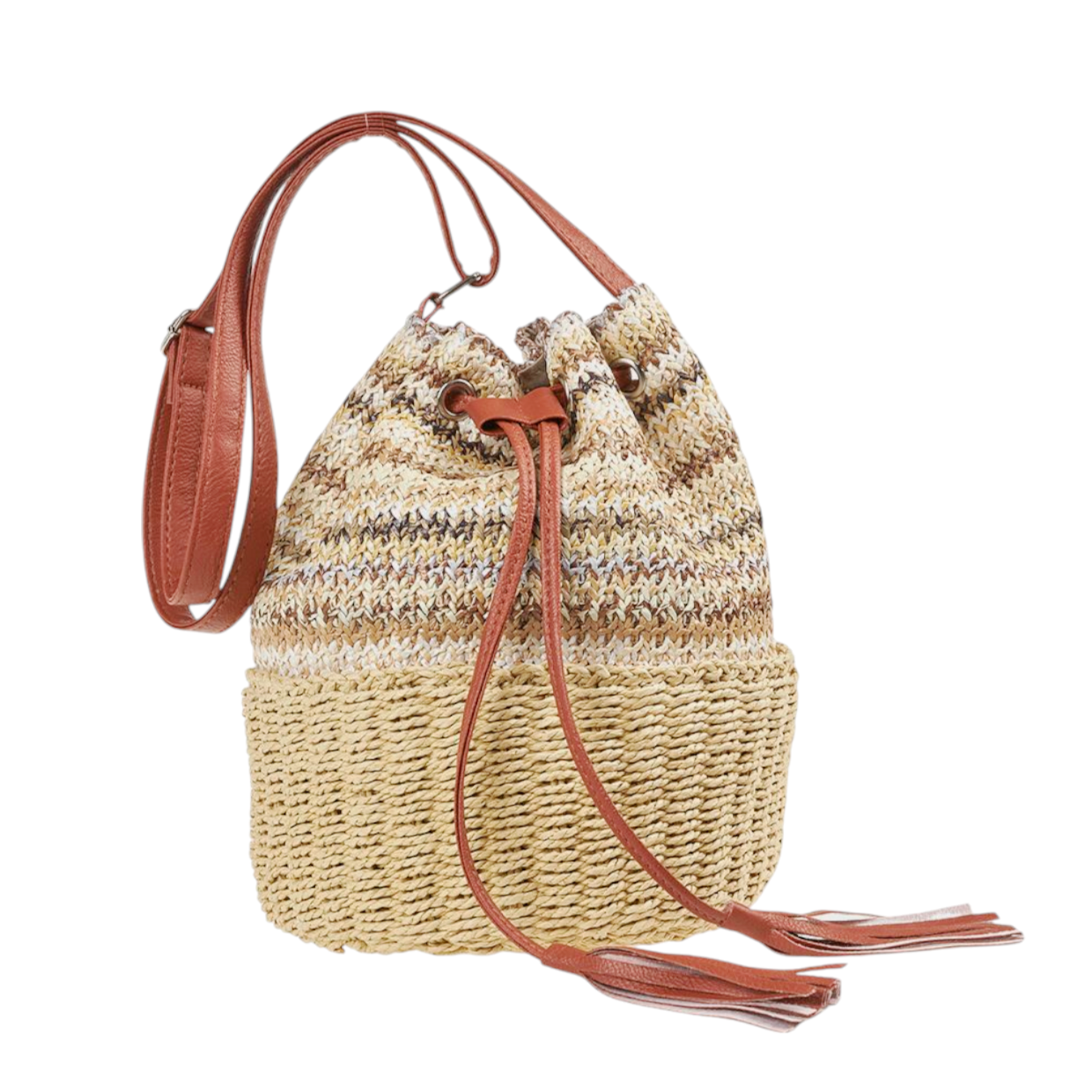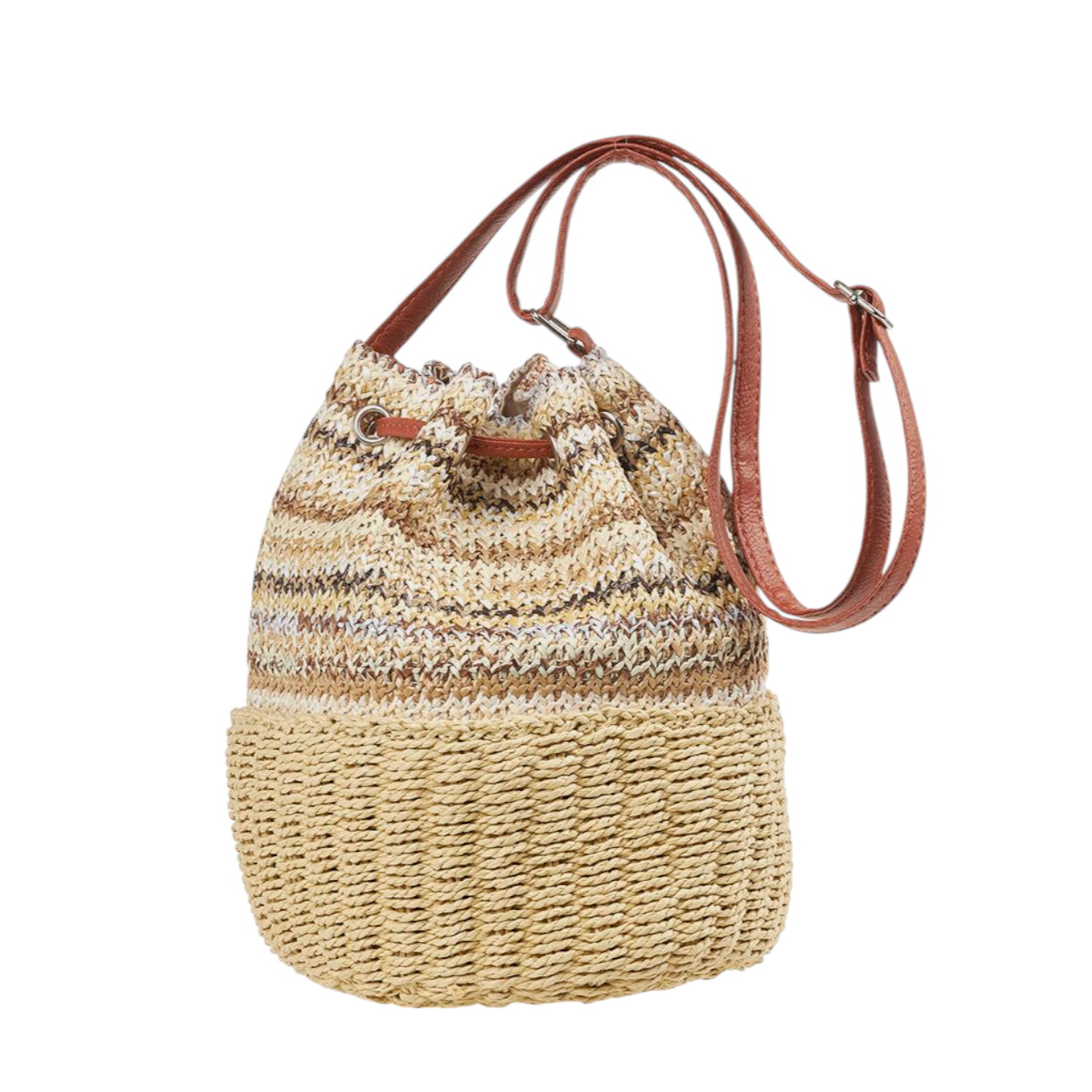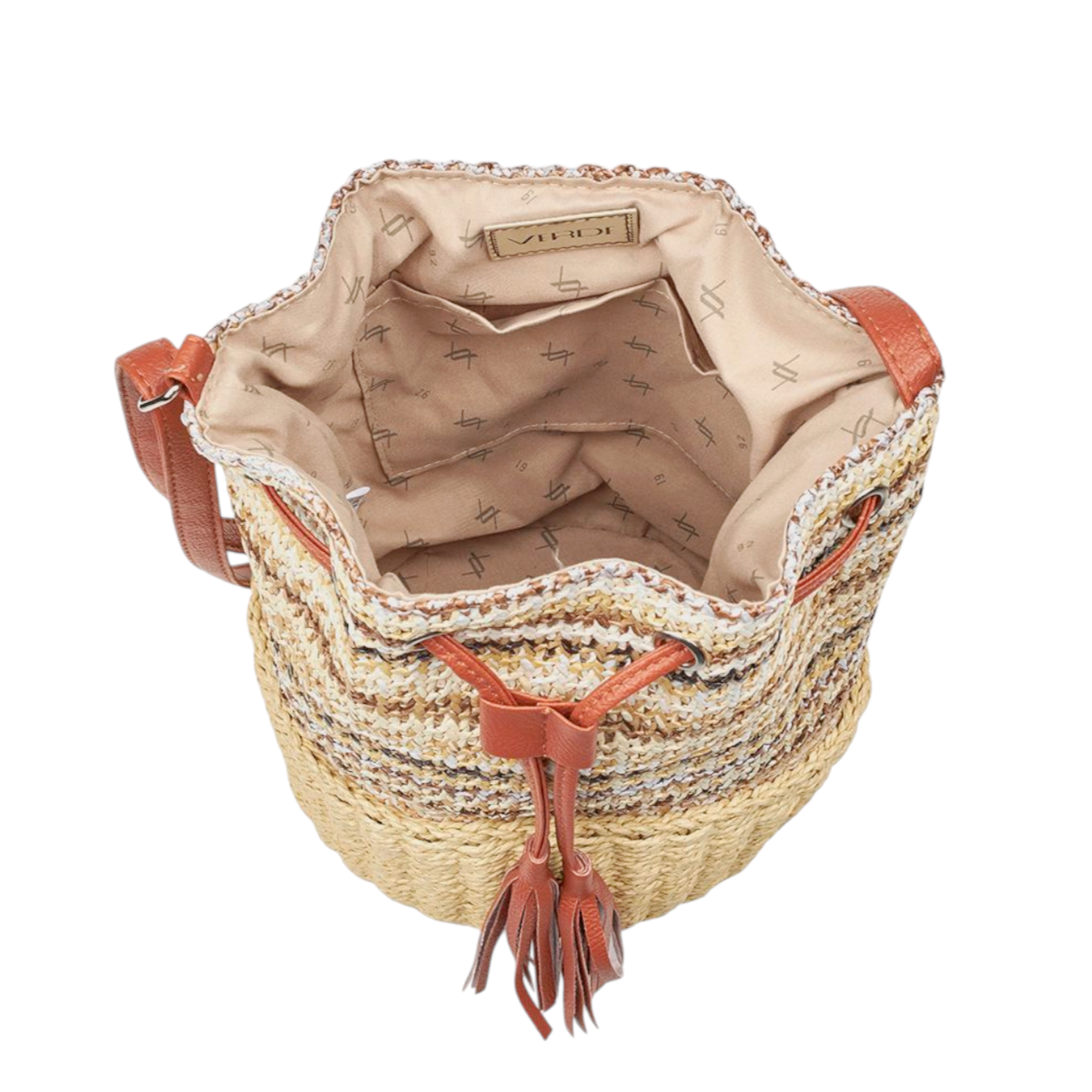 Ψάθινο πουγκί χιαστί Verde 48-276. Κλείνει με κορδόνι. Διαθέτει εσωτερικά 1 ανοιχτή τσέπη.